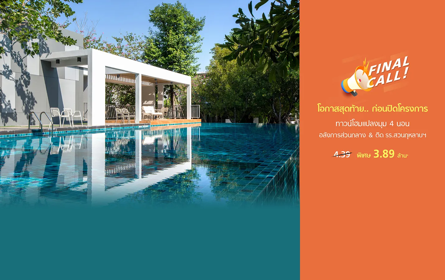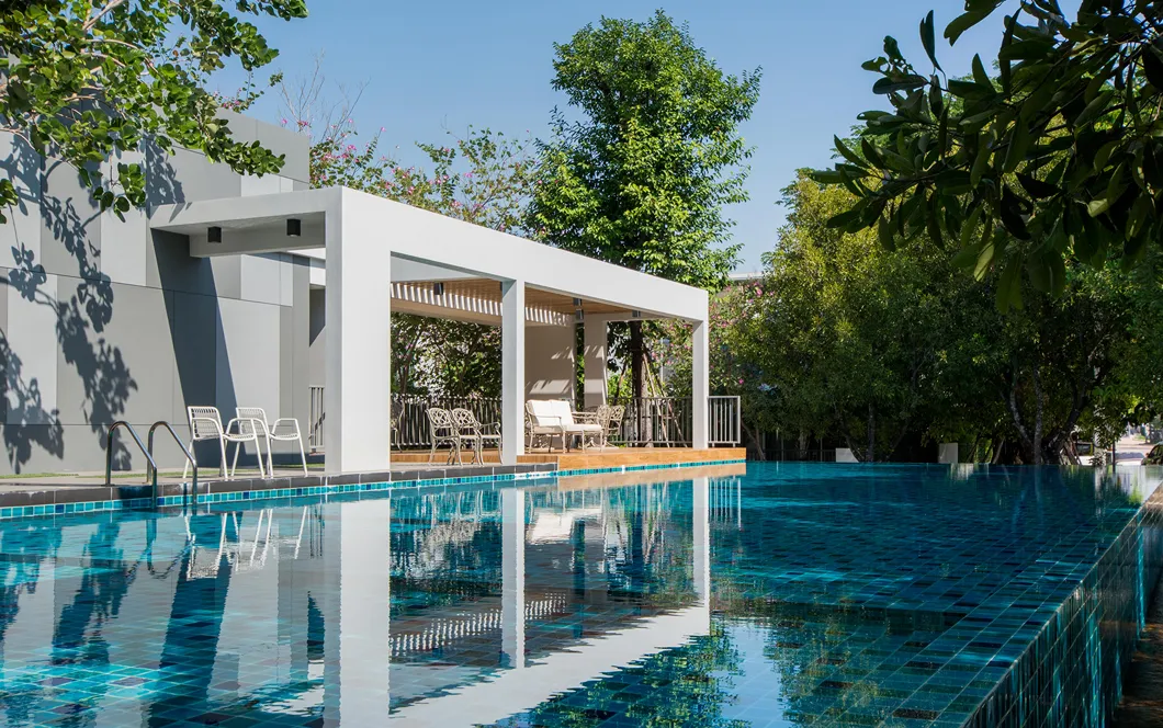 สโมสรส่วนกลาง ดีไซน์โปร่งโล่ง สัมผัสบรรยากาศแห่งการพักผ่อน พร้อมสระว่ายน้ำระบบเกลือ ท่ามกลางวิวธรรมชาติ