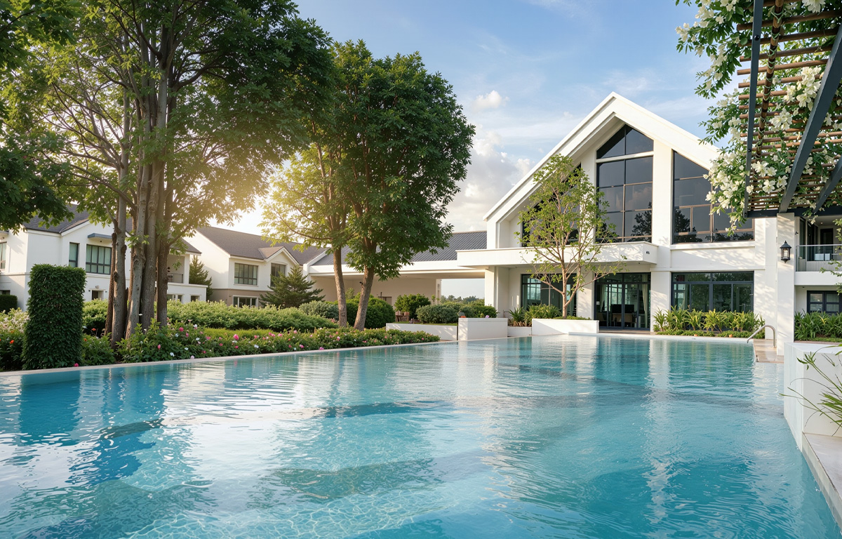สระว่ายน้ำระบบเกลือขนาดใหญ่พิเศษ พร้อมสระเด็ก แยกเป็นสัดส่วน โอบล้อมด้วยวิวธรรมชาติ ร่มรื่น สบายตา