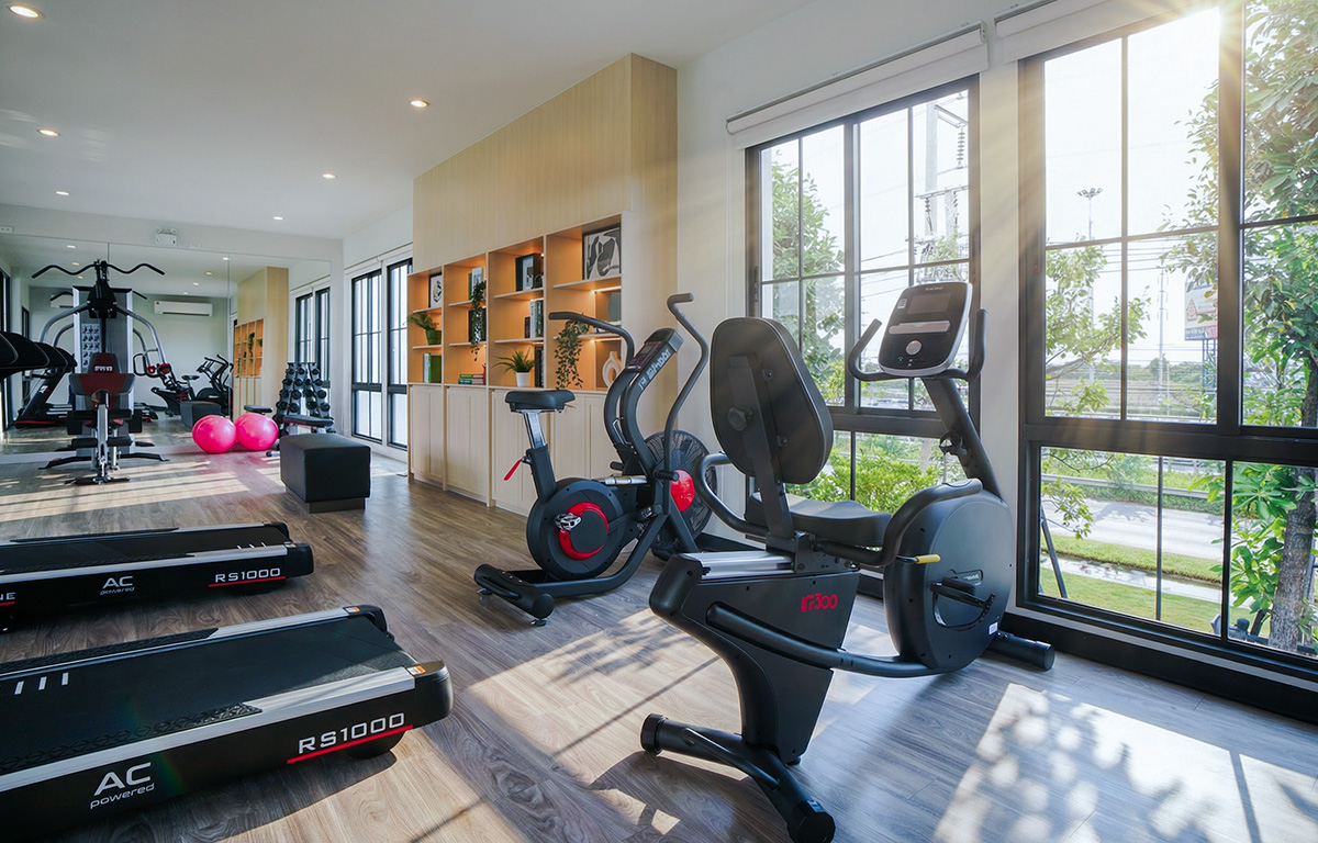 ห้องออกกำลังกายอุปกรณ์ครบครัน ให้สมาชิกได้ออกกำลังกาย พร้อมสัมผัสวิวธรรมชาติภายนอก