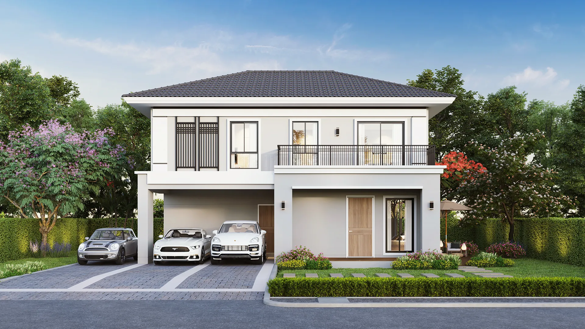 - บ้านเดี่ยว 2 ชั้น สไตล์ Modern Oriental ที่ดินเริ่มต้น 100 ตร.ว. ขึ้นไป จอดรถได้ 6 - 8 คัน